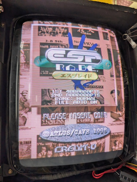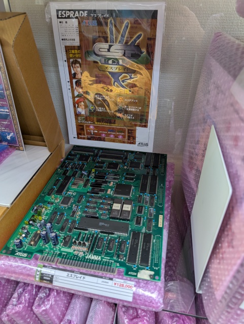 この他にもケイブが開発しアトラスが販売を行った「エスプレイド」も入荷しております!こちらも井上淳哉先生がキャラクターやゲームデザインに携わった作品です。ケイブ初の戦闘機ではなくキャラクターが空を舞い敵を直接攻撃するタイプの作品で、その後のケイブにも「エスプ」シリーズとして大きな影響を与えた作品ではないでしょうか。