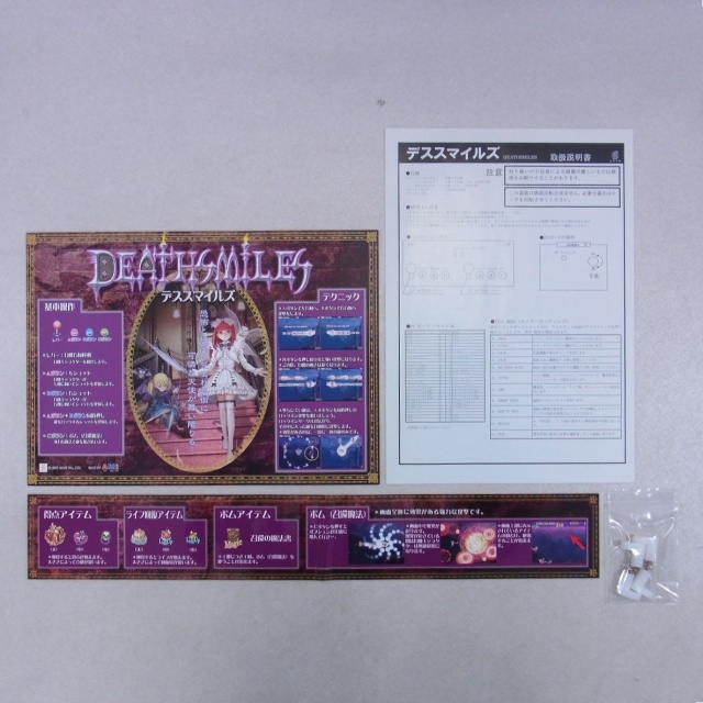 こちらの商品はその「デススマイルズ」の初代のアーケード基板です。発売当時に付属していた専用の外箱に大きな折りたたみ式のPOP、A4サイズのインストカード、筐体に貼る帯シールと説明書などの付属品が全て純正品となります。AMIのロゴの入った当時物のチラシも同梱されています。おそらくシリーズのアーケード基板の中では一番売れたタイトルですが、これほどのコンディションとなると熱心なファンが個人で購入した物くらいしかありませんので数は極端に少なくなります。