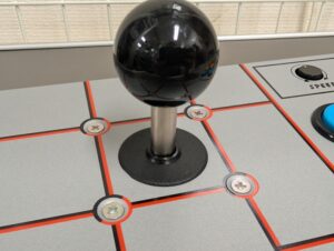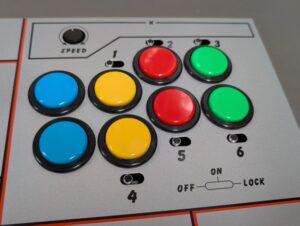 レバーは多くの業務用筐体で採用されているセイミツ工業製の「LS-32」が付いています。ボタンも同じくセイミツ工業の定番押しボタン「PS-14-G」が採用されています。黒ブチのボタンがレトロ感を演出していて渋い雰囲気ですね。