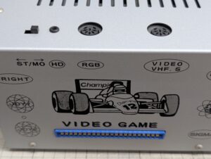 本体のAV7000を見てみますと、前面のフォーミュラーカーのイラストが目を引きますね。その他はコネクタの表記がデザインのように描かれています。メインのハーネス接続コネクタは44ピンでAV-5000以降はこのコネクタになっています。上部には音声のステレオ/モノラル切り替えと音声出力端子の他、専用のアナログRGBとビデオの映像出力端子があります。